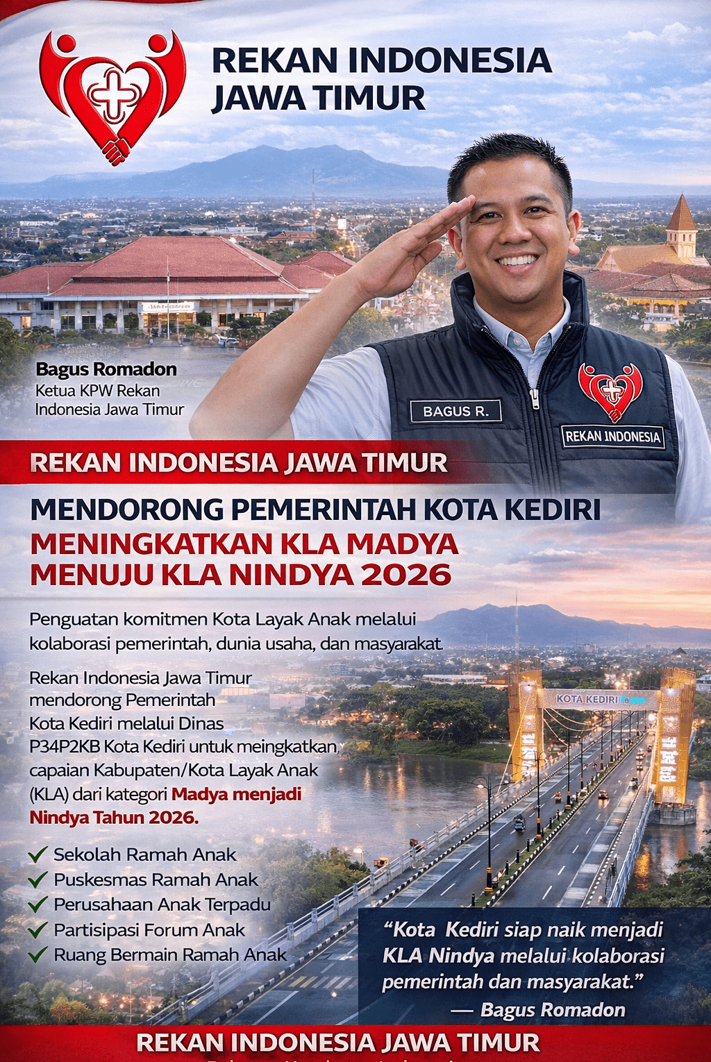 Kediri, bhagawantanews.id— Ketua KPW Rekan Indonesia Jawa Timur, Bagus Romadon, mendorong Pemerintah Kota Kediri melalui Dinas P3AP2KB Kota Kediri untuk meningkatkan capaian Kabupaten/Kota Layak Anak (KLA) dari kategori Madya menjadi Nindya pada tahun 2026.