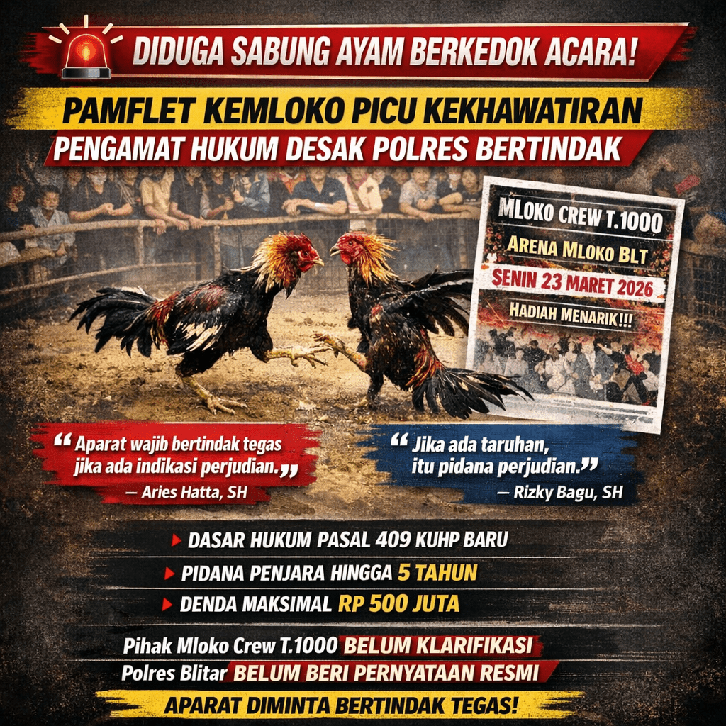 BLITAR – Sebuah pamflet yang beredar luas melalui pesan WhatsApp menghebohkan warga Desa Kemloko 4, Kecamatan Garum. Informasi dalam selebaran tersebut diduga kuat mengarah pada rencana kegiatan sabung ayam, praktik yang jelas melanggar hukum.