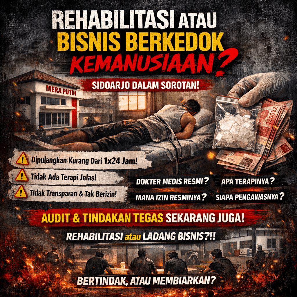 Sidoarjo – Dugaan praktik “abal-abal” dalam layanan rehabilitasi narkotika di Jawa Timur mencuat dan memantik kemarahan publik. Sebuah rumah rehabilitasi bernama Mera Putih yang berlokasi di Jl. Blimbing I No.18, Ngipa, Wadungasri, Kecamatan Waru, Kabupaten Sidoarjo, diduga tidak menjalankan proses pemulihan sebagaimana mestinya.