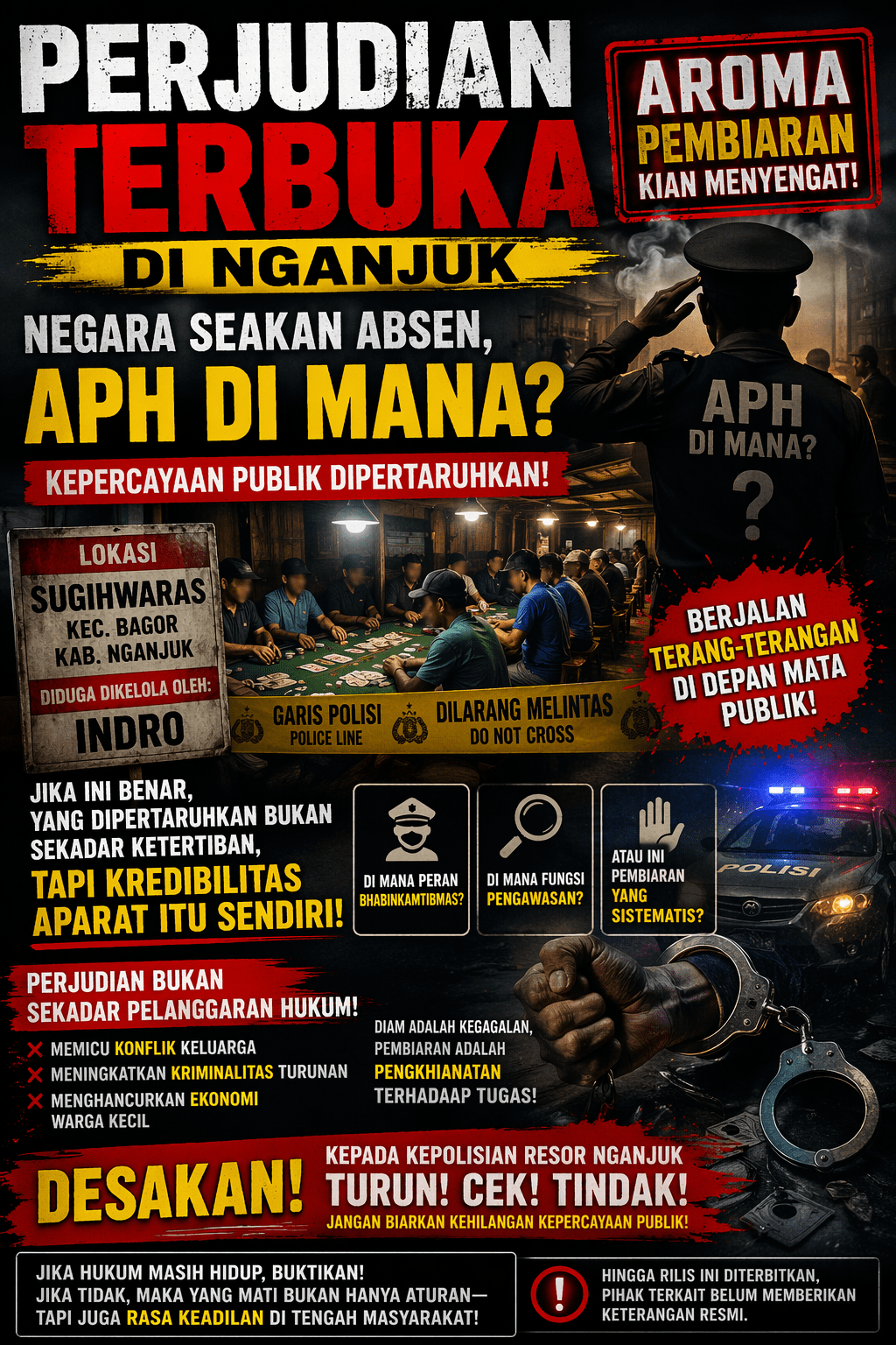 Kami mendesak Kepolisian Resor Nganjuk untuk tidak menutup mata. Turun, cek, tindak. Jangan biarkan publik kehilangan kepercayaan. Jika hukum masih hidup, buktikan. Jika tidak, maka yang mati bukan hanya aturan,tapi juga rasa keadilan di tengah masyarakat.