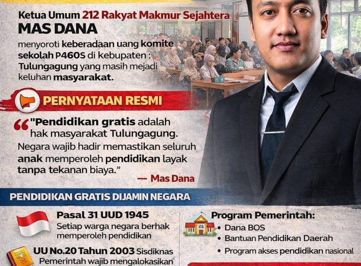 Tulungagung — Ketua Umum 212 Rakyat Makmur Sejahtera, Mas Dana, menyoroti keberadaan uang komite sekolah atau Paguyuban...